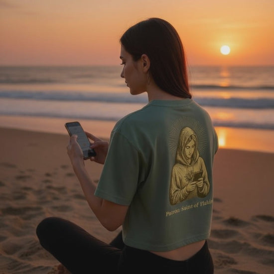 This ultra-soft cotton crop tee honors the true patron saint of introverts everywhere — the one who blesses unread texts and canceled plans. With its relaxed fit and perfectly cropped cut, it’s comfy enough for your couch confessions and stylish enough for your “maybe next time” selfies.